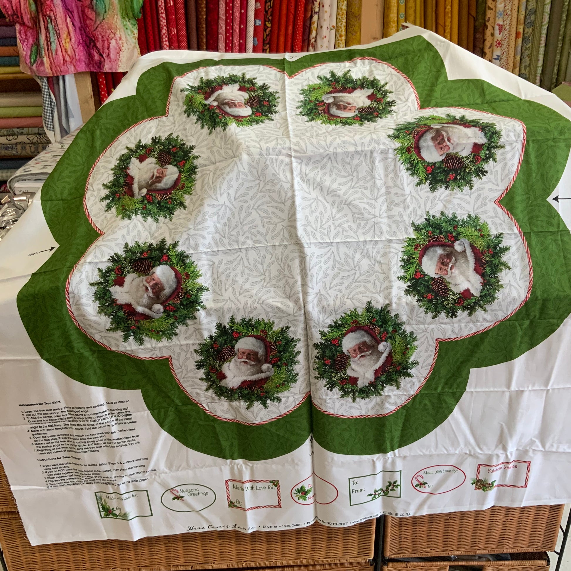 Digitally printed circular design with scalloped edges that can be made into either a tree skirt or a table centre.