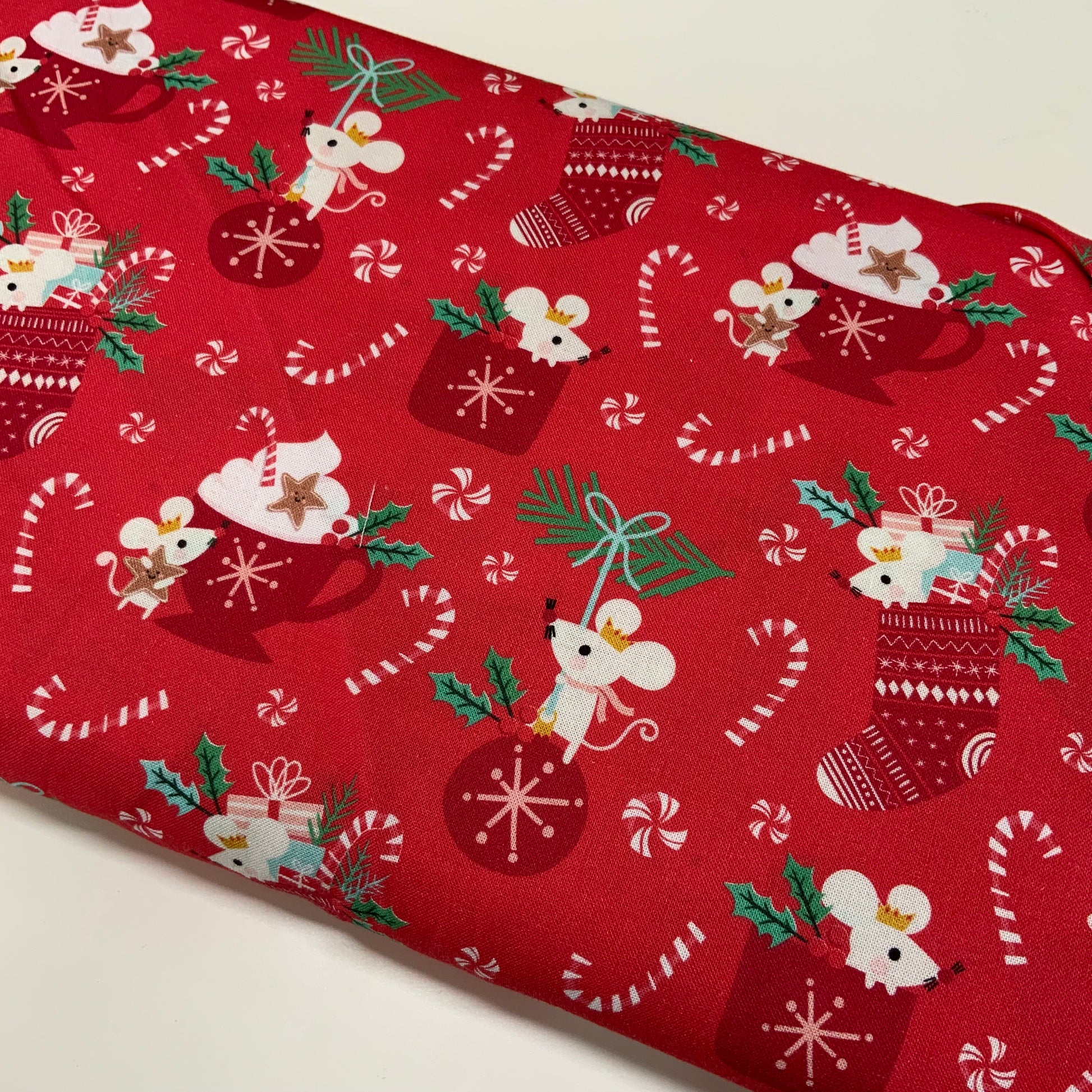 Very cute white mice playing with Christmas stockings, baubles etc.